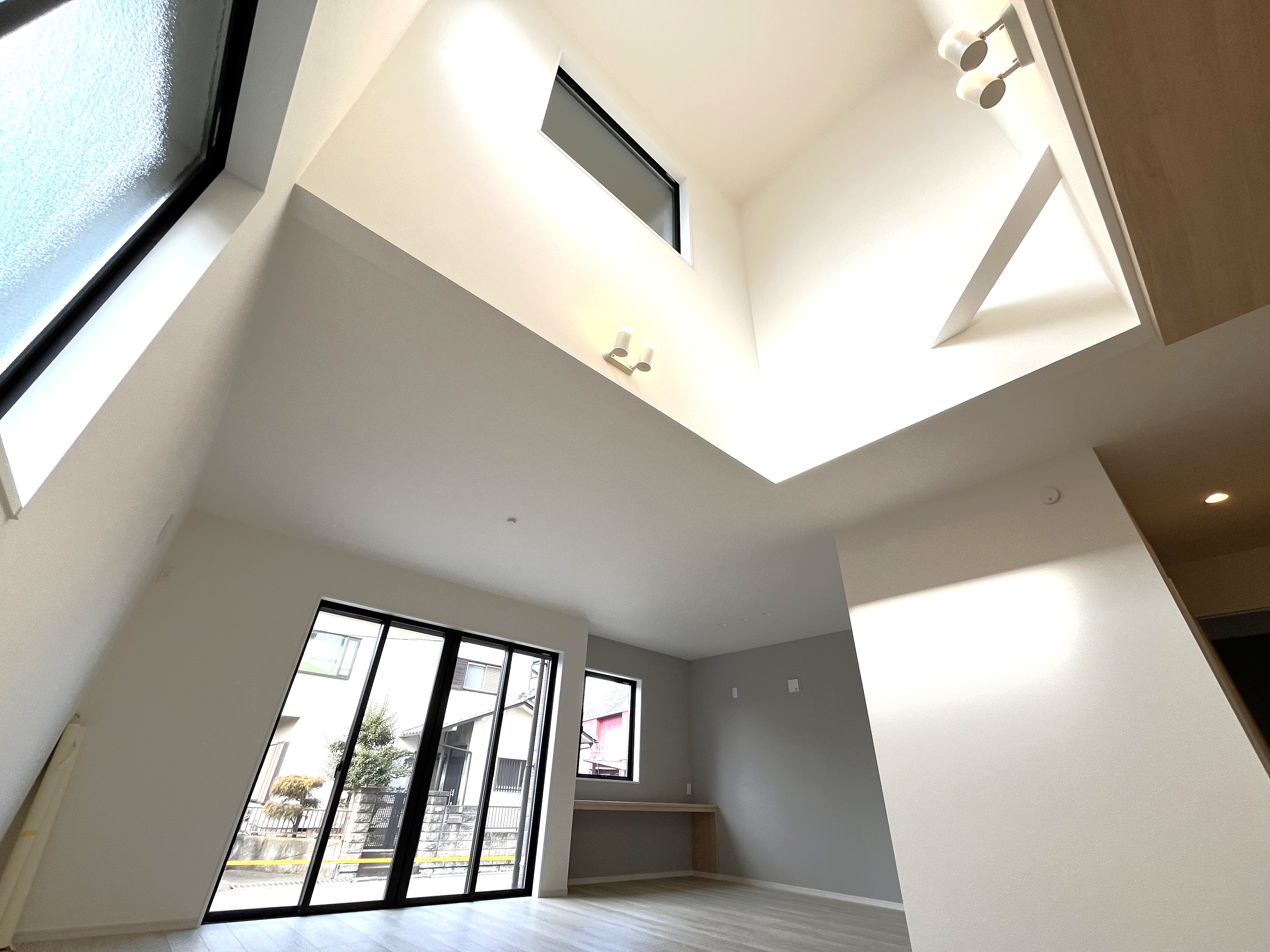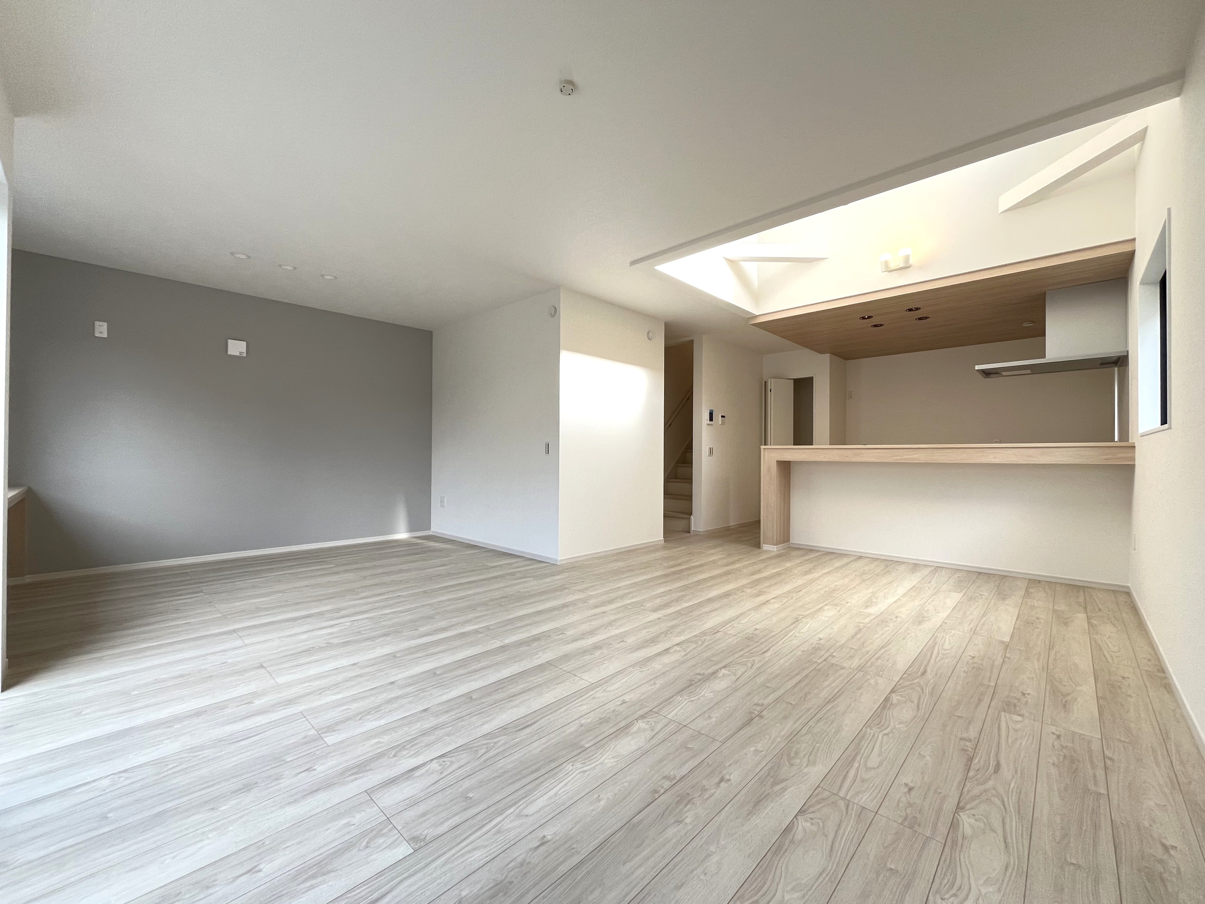 アクセントクロスが引き立つ吹抜けのある広々22.9帖リビングです