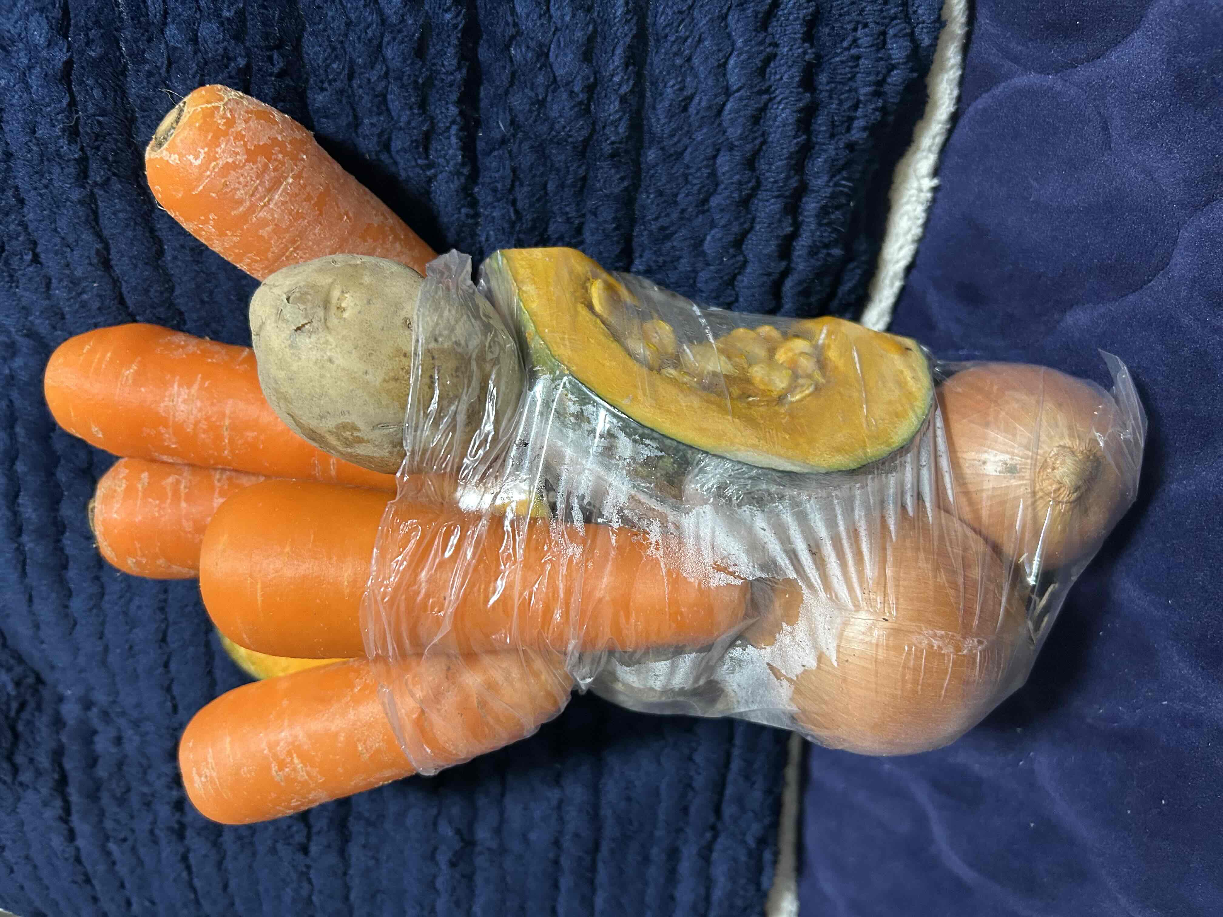 袋をゆっくり引き伸ばして広げてから、入れる野菜の順番を考えながら悪戦苦闘。